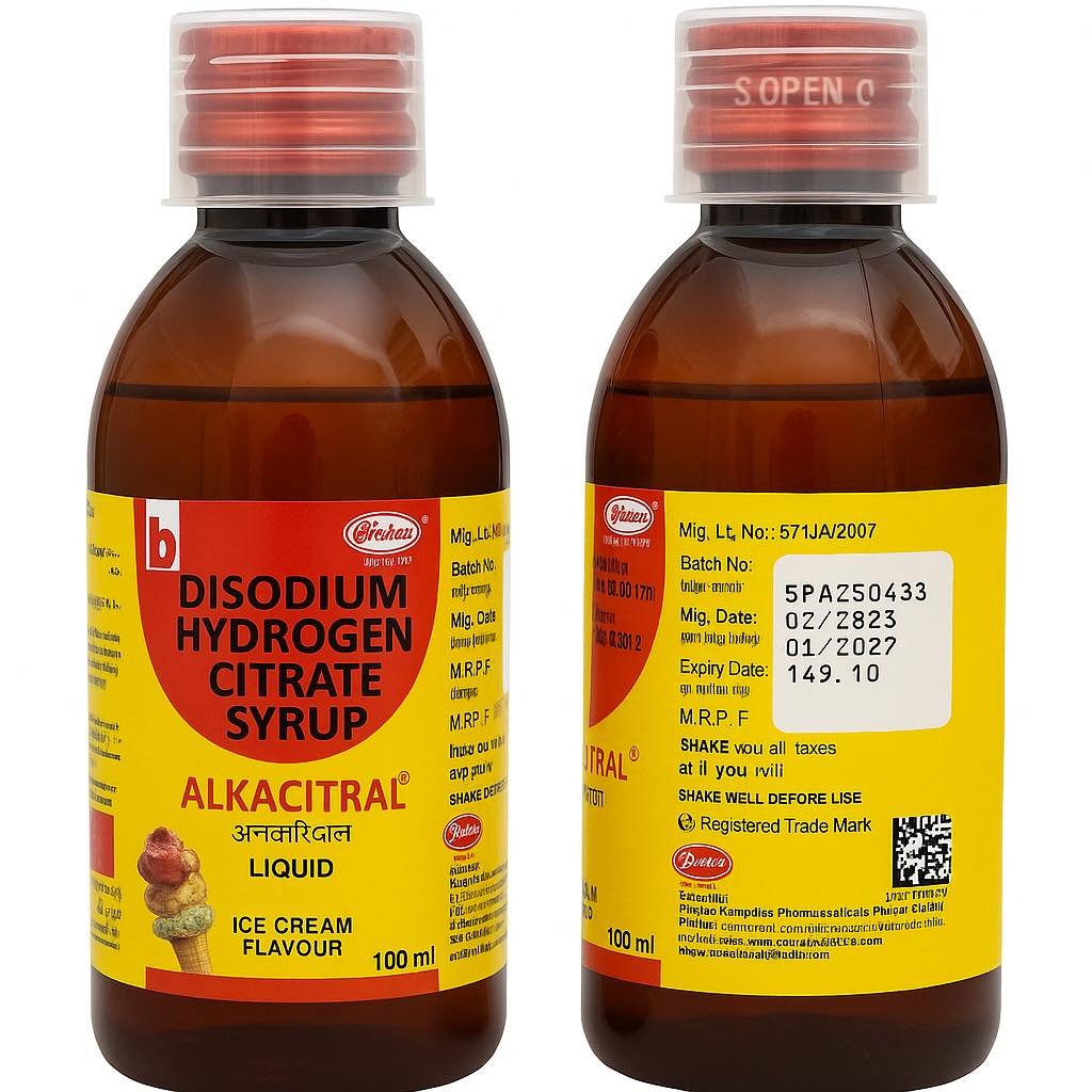 Alkacitrol 100 ml is an oral urinary alkalizer (disodium hydrogen citrate) that raises urine pH to help dissolve and prevent kidney stones and reduce gout symptoms. Administer as a syrup—shake well and take regularly (with or without food). Possible side effects include stomach upset, diarrhea, nausea, tiredness, and frequent urination